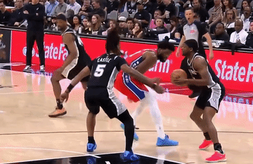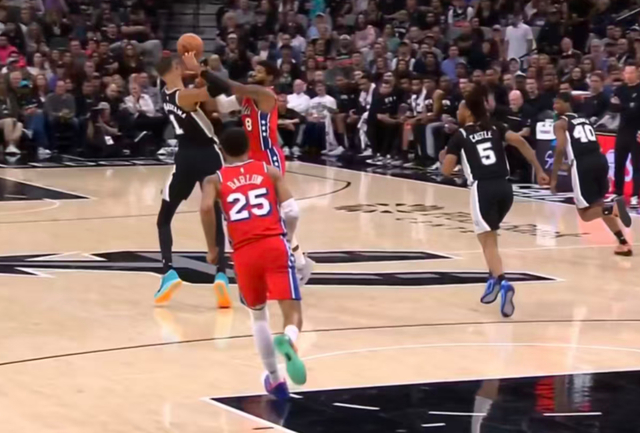 文班第二节刚开打没多久,断球后快下的时候,被乔治拉了一把。